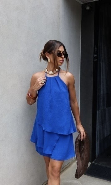 Vestido Curto em Duna Air Flow, possui amarração no pescoço por tiras fixas. Parte traseira possui elástico para melhor caimento da peça ao corpo. Barra com acabamento pespontado simples. Não possui forro.